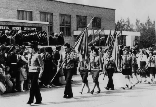 9 мая 1981 г. - торжественное прохождение школы на плацу части. В пионерской знаменной группе Щеренко Алексей, Хмылева Татьяна Щеренко Алексей